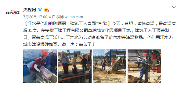 安徽日報、央視網微博——汗水是他們的防曬霜 建筑工人直面“烤”驗